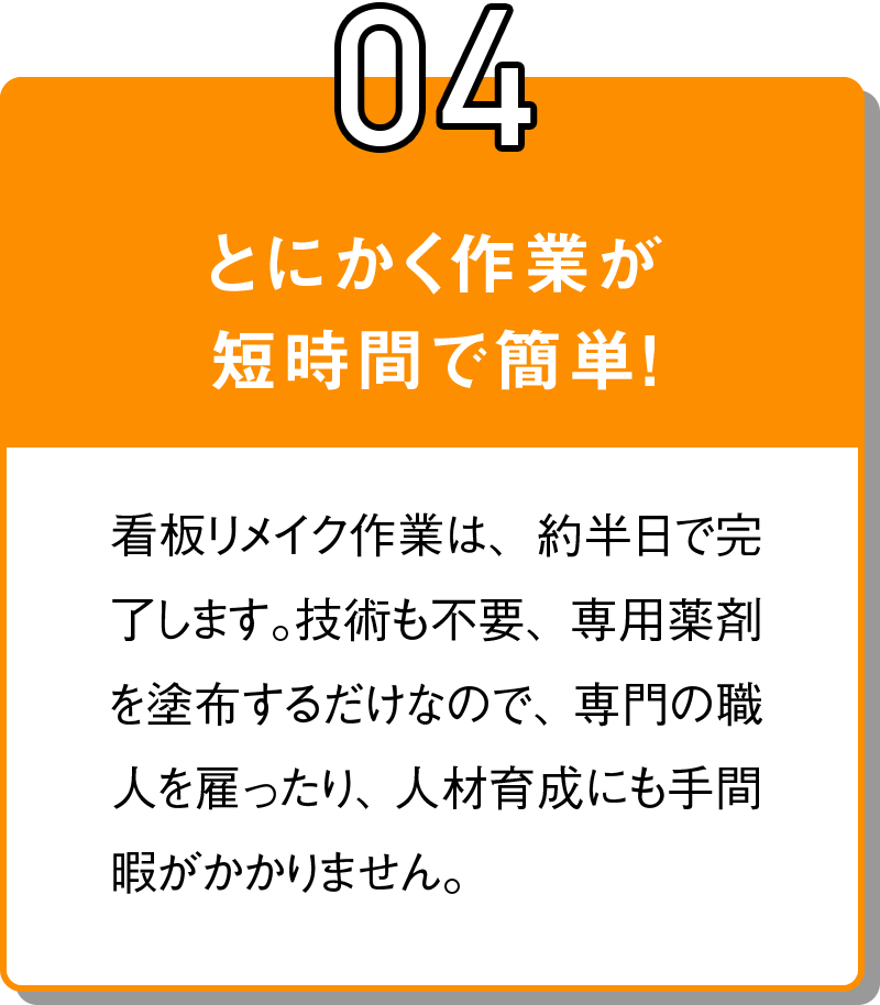 それに比べて、「看板復活」であれば、コーティング剤を一様に塗る施工ですので、仕上がり、コスト、施工期間など、いずれをとっても塗り直しより有利です。